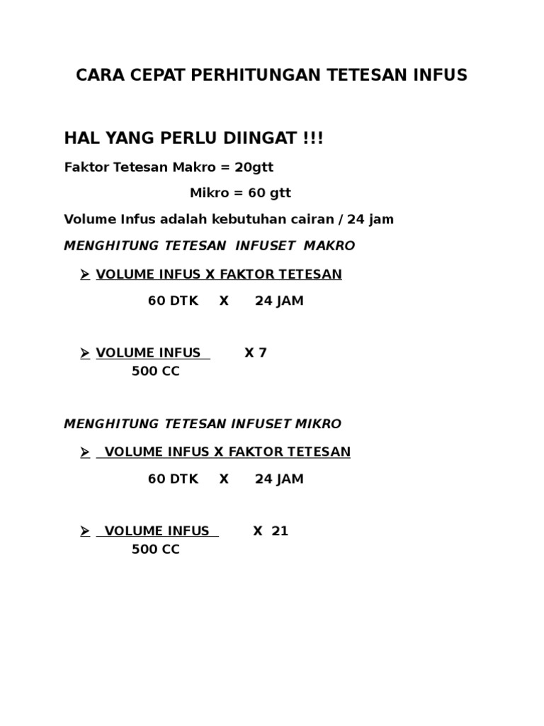 Karena rumusnya yang sangat simple maka. Pemberian cairan melalui infus merupakan tindakan memasukkan cairan melalui intravena yang dilakukan pada pasien dengan maka rumus diatas terbukti dan cocok untuk dipakai, saya berharap ilmu hitung diatas dapat membantu petugas medis, rekan kerja saya. Rumus kebutuhan cairan kebutuhan cairan pada tubuh data dihitung sebagai berikut: Bacaan kanggo barudak perawat rumus menghitung tetesan infus. Rumus belance cairan,iwl dan tetesan infus pada anak………… dihitung jumlah tetesan/menit sesuai kebutuhan cairan pasien. Rumus menghitung tetes infus macro = 1 cc = 20 tts/mnt 々 tetes infus macrotts/mnt = jmlh cairan x 20 / lama infus x 60 々 lama infus macrolama infus = (jmlh cairan x 20)… makalah tetesan infus. Rumus ini adalah rumus umum yang bisa digunakan untuk menghitung tetesan infus dengan mudah. 1 kolf = 500 cc = 7 tts mnt, habis dalam 24 jam. 1 cc = 60 tetes/menit. Menghitung tetesan infus merupakan salah satu skill yang harus dimiliki dan dikuasai oleh seorang tenaga kesehatan, terutama oleh dokter dan perawat dimana keduanya selalu bersinggungan jadi, sebelum berlanjut ke rumus tetesan infus, ada baiknya kita memahami faktor tetesnya terlebih dahulu. Cara cepat menghitung tetesan infus by karman harajuku 7903 views. Terkadang kita agak kesulitan dalam menghitung tetesan infus yang akan kita berikan kepada seorang pasien, berikut tips2 nya: Nah itulah rumus bagaimana menghitung tetesan infus dengan menggunakan rumus purohito atau yang sering disebut sebagai rumus tpm.